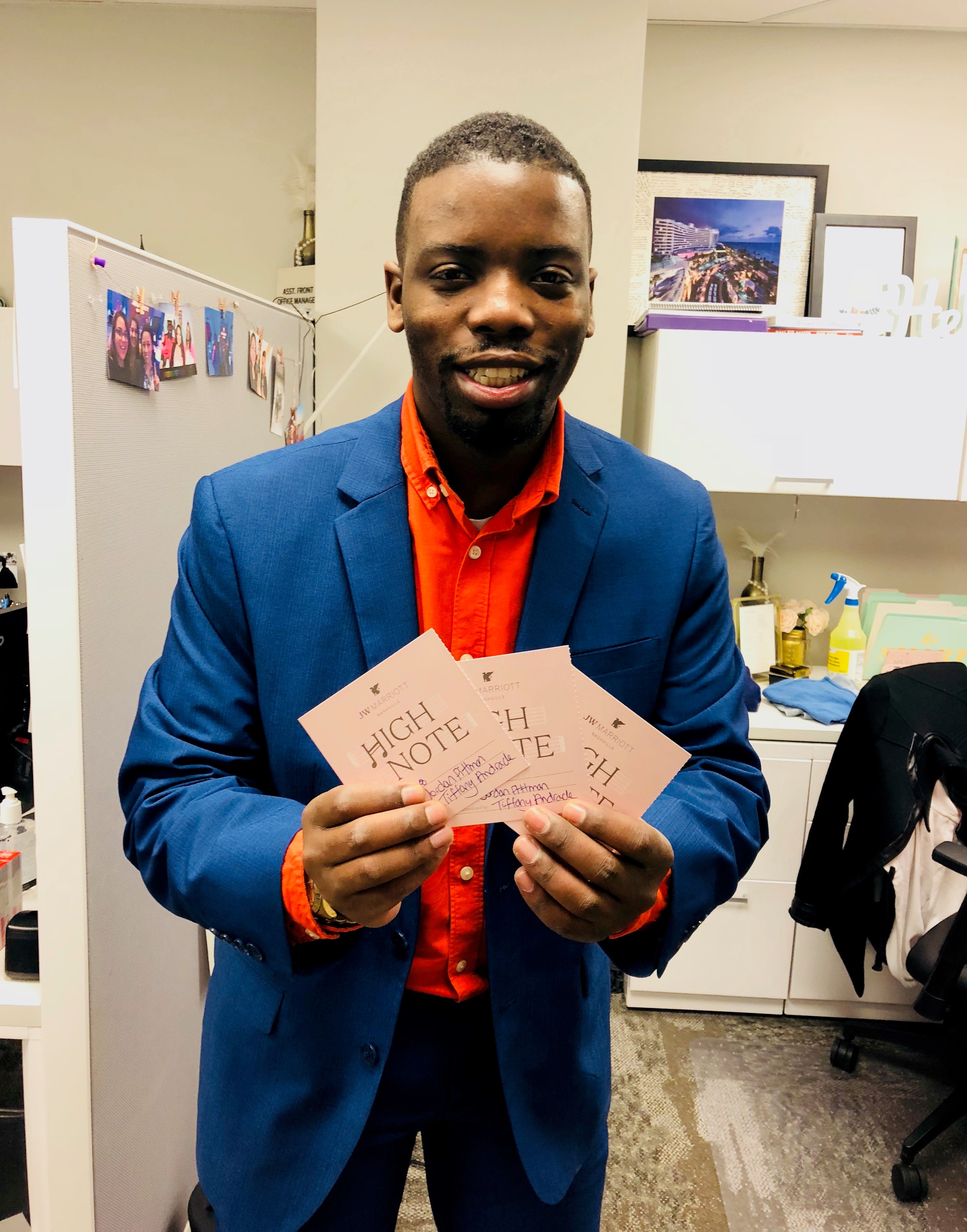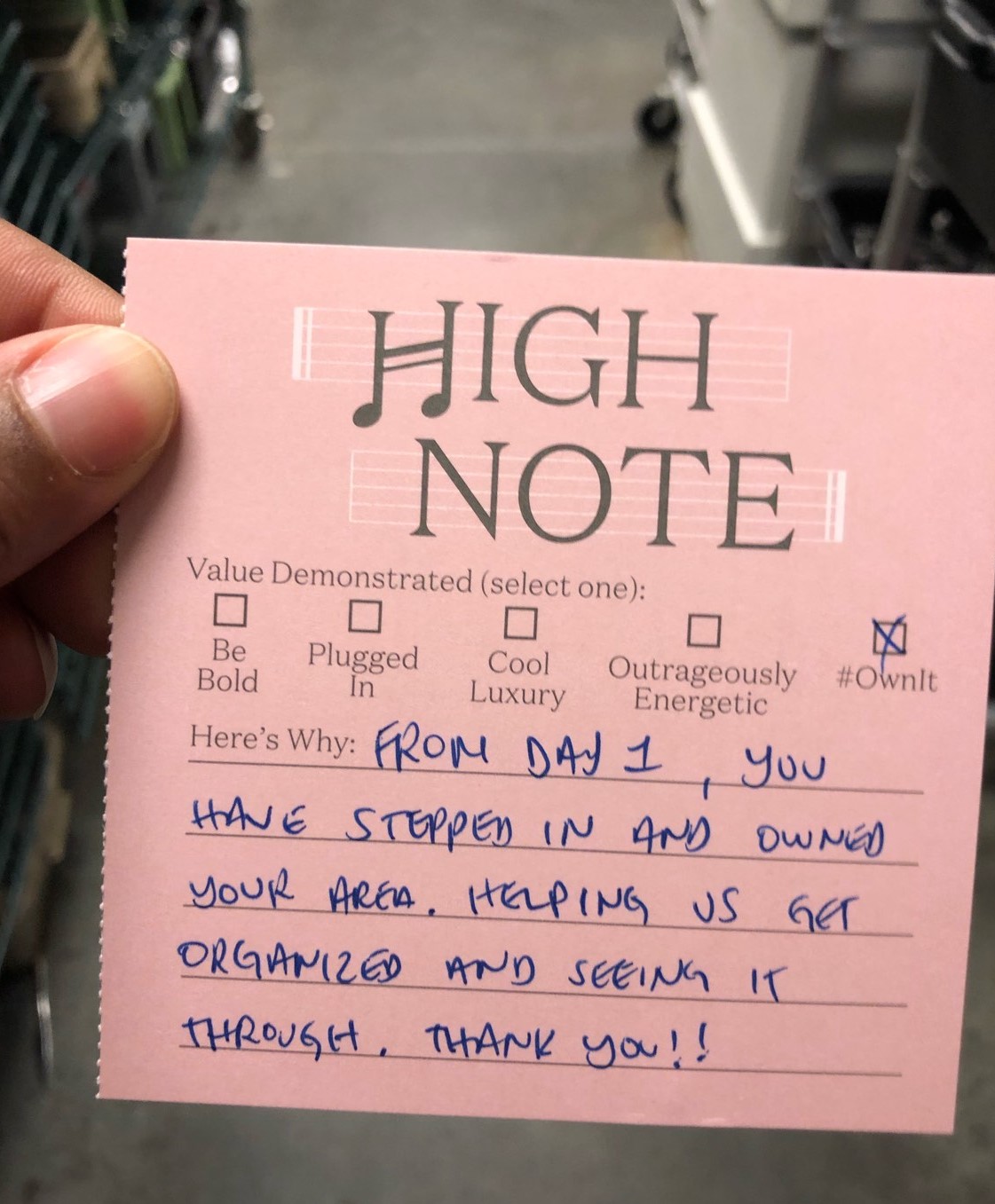 Each High Note includes a personalized message from a coworker, along with which company Value was exhibited. Here, an employee shows off her very first High Note!