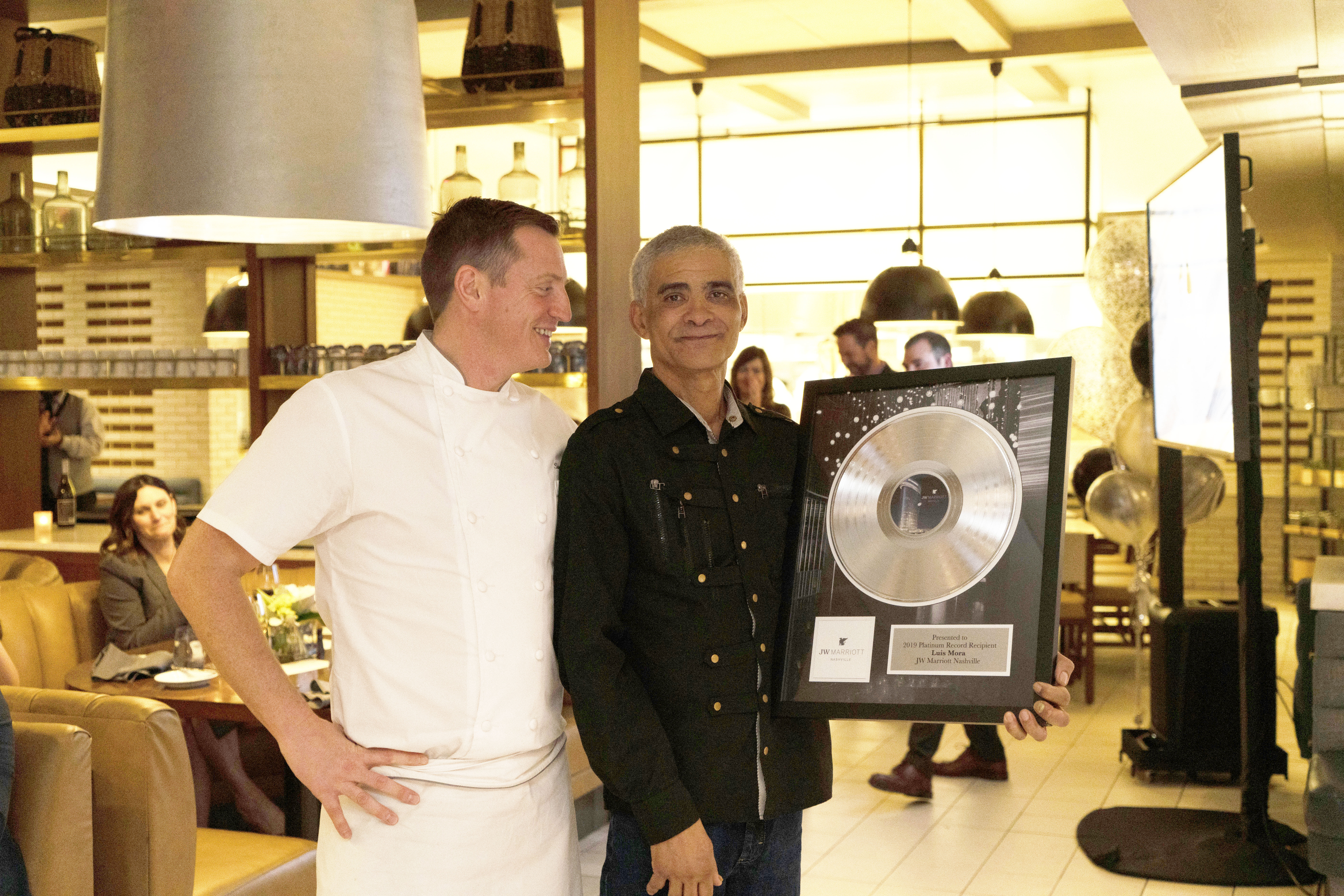 Platinum Record Recipients receiving a celebratory fist bump from fellow Gold Record winner.